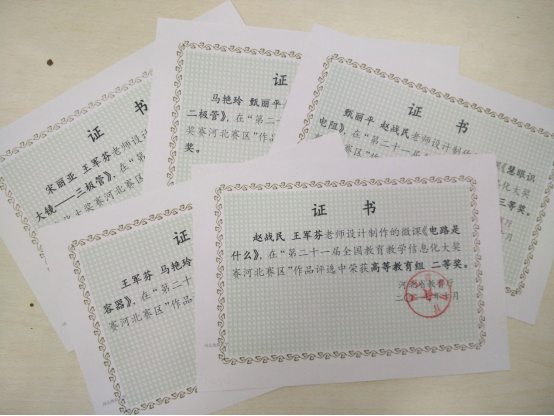 由赵战民、王军芬老师主持的作品《电路是什么》、由宋丽亚、王军芬老师主持的《电流放大镜——三极管》两件作品获得高等教育组二等奖。由甄丽平、赵战民老师主持的《慧眼识电阻》、由马艳玲、甄丽平老师主持的《神奇的二极管》、由王军芬、马艳玲老师主持的《秒懂电容器》三件作品获得高等教育组三等奖。