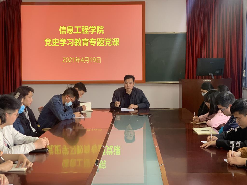 在党的百年华诞即将来临之际,为了深入学习贯彻习近平总书记在党史学习教育动员大会上的重要讲话精神,全面落实党中央部署要求以及省委、学校党委的工作部署,4月19日下午4时,信息工程学院党委书记王树明为全体学生党员作了题为“认真学习党史,凝聚新时代力量”的党史学习教育专题讲座。