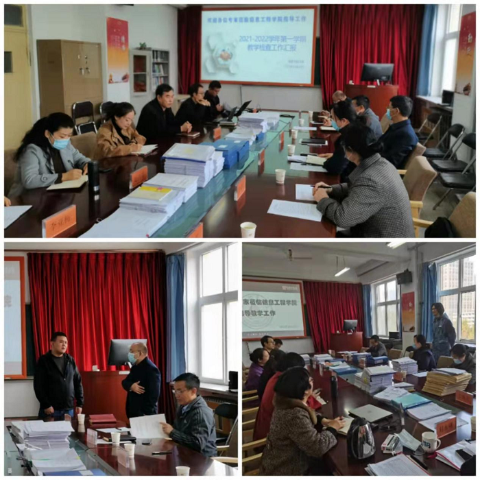 李明亮副院长代表学院向检查组汇报了学院2020—2021学年的教学工作。过去的一年里,学院坚持两极一体化跨越式发展思路,科普极、创新极齐头并进,学院管理运行、学科专业建设、教师发展、学生培养一体化,为学院教学工作指明了发展方向。学院通过智能时代信工人岗位职责大讨论、“我是谁”系列主题班团日活动、全员全程导师制等创新举措为学院教学工作注入了源源不断的内生动力。学院在工程教育专业认证、一流专业建设、一流课程建设、课程思政建设、教学改革研究项目及教师讲课比赛等方面取得了丰硕成果。完成了教学任务、教学建设及教学秩序管理的自查工作,并督促学院教师学习河北省教育厅转发教育部的关于印发《普通高等学校本科教育教学审核评估实施方案(2021—2025年)》的通知。