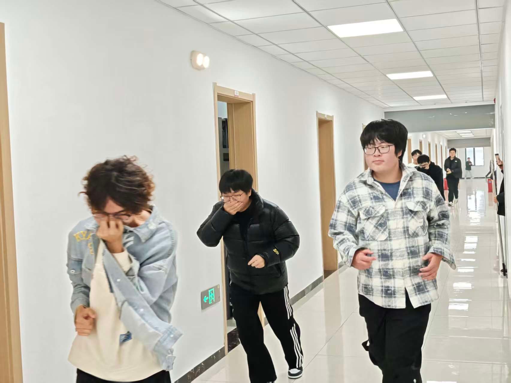 “大家不要慌,捂住口鼻,弯腰低姿,沿安全通道快速下楼!”在老师和学生干部的指引下,同学们反应迅速,动作规范。他们用提前准备好的湿毛巾紧紧捂住口鼻,压低身体,沿着墙壁一侧的疏散指示标志,快速、有序地向楼下安全地带撤离。