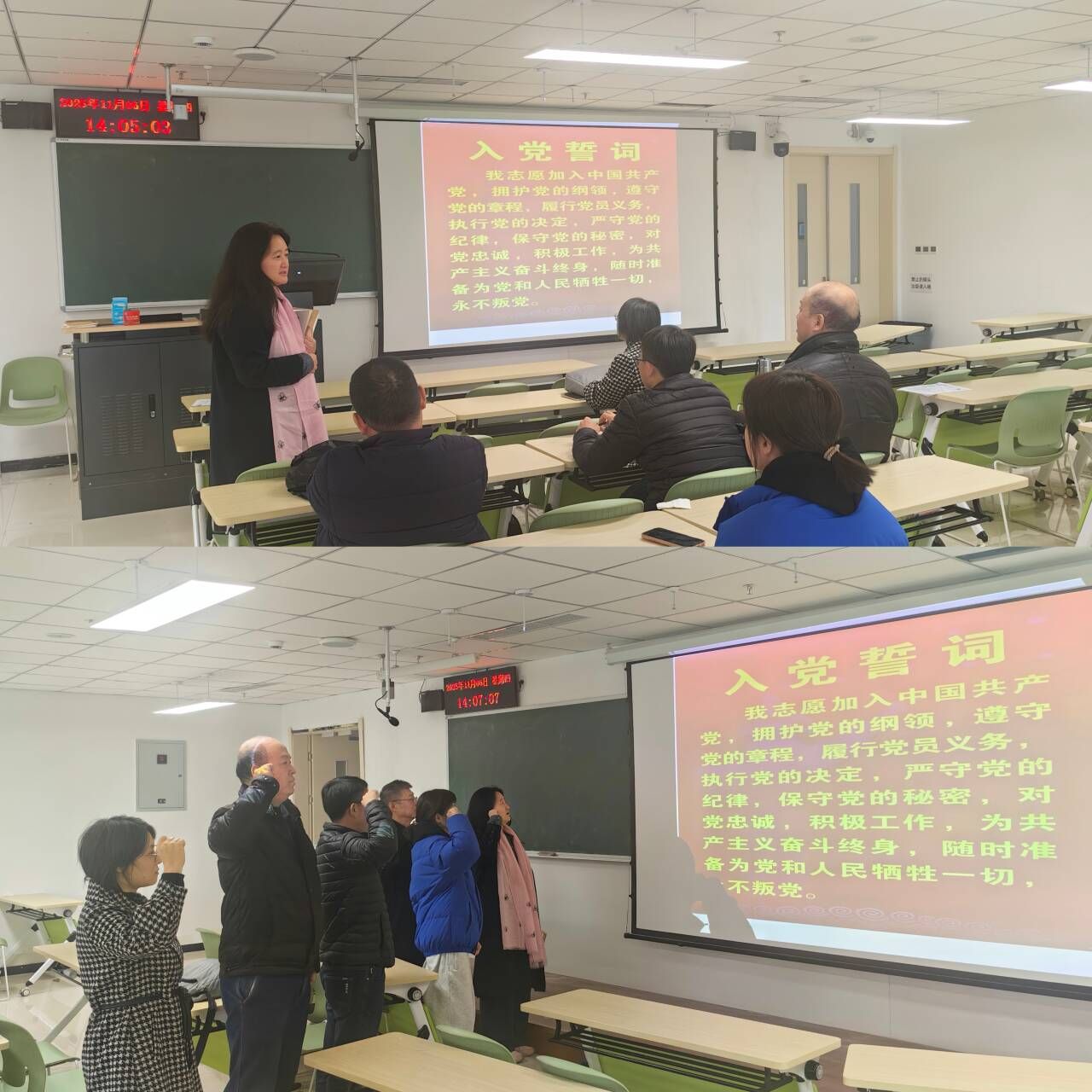 为持续强化党员理论武装,深刻领会新时代党的创新理论,进一步增强党员教师的使命感和责任感,2025年11月6日下午2:30,信息工程学院教工第二党支部在教学1号楼311教室,围绕“重温党章明确党员义务、学习《习近平谈治国理政》第五卷第五章”主题,组织开展了一场内容丰富、意义深刻的主题党日活动。