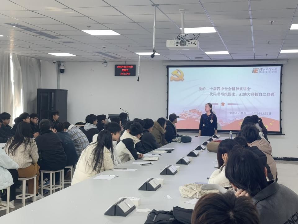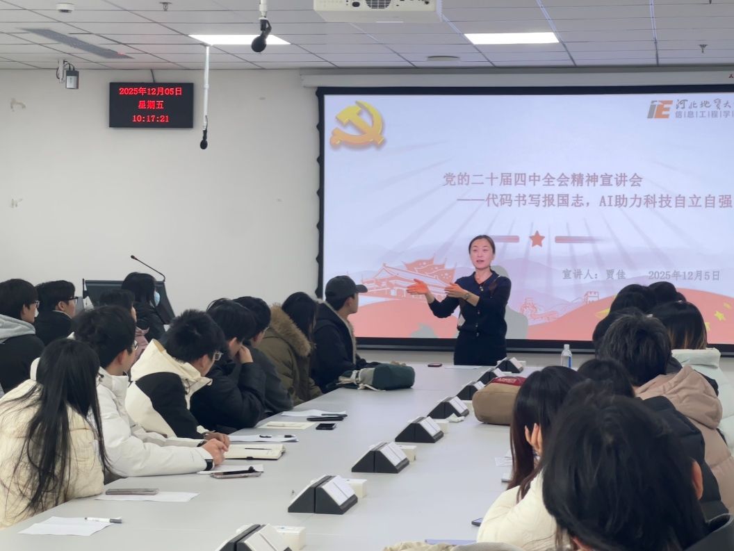 2025年12月5日上午十点,信息工程学院学生党支部在实验楼401组织召开“青春向党·数智报国”党的二十届四中全会精神专题宣讲会。会议由学院党委副书记贾佳主讲,23级学生党员干部参加,围绕全会精神与信息学子的专业发展、技术报国使命展开深入交流。