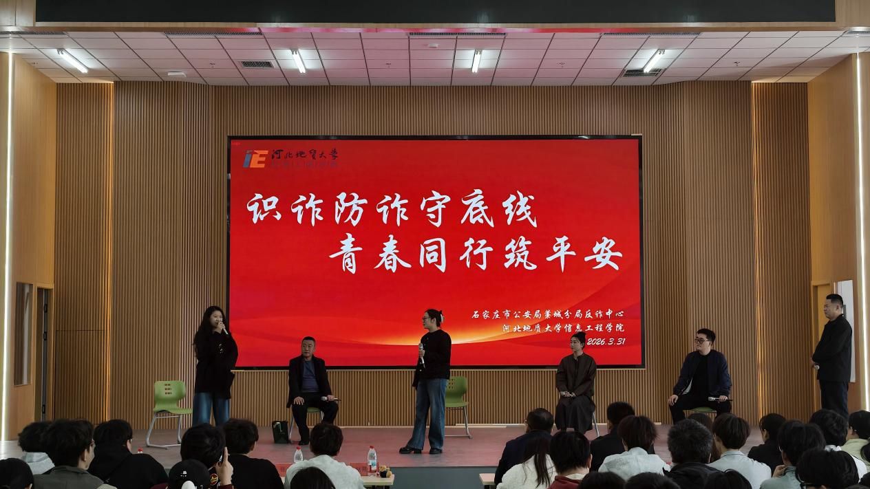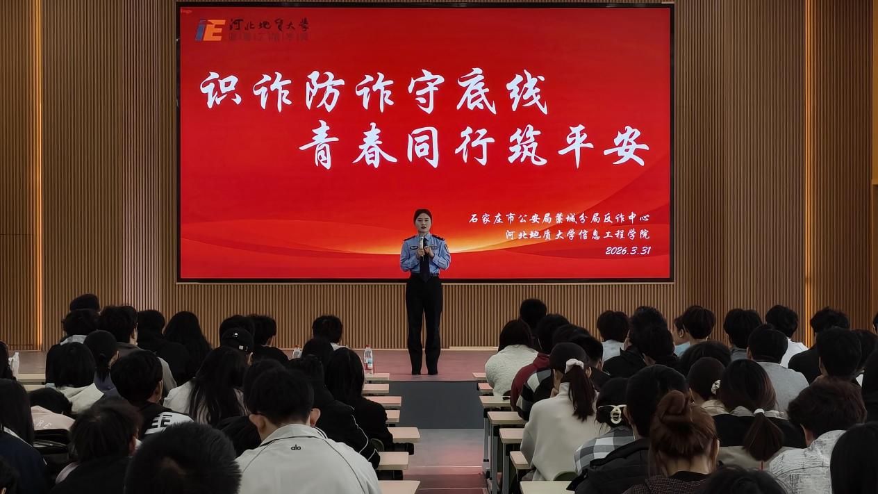 为切实提升广大师生的防骗识诈能力,筑牢校园安全屏障,近日,河北地质大学信息工程学院携手石家庄市公安局藁城分局反诈中心,共同举办了一场主题鲜明、内容丰富的反诈宣传进校园活动。本次活动以“识诈防诈守底线 青春同行筑平安”为主题,通过情景演绎、案例剖析、互动讲解等形式,为在场师生带来了一场干货满满的安全教育课。