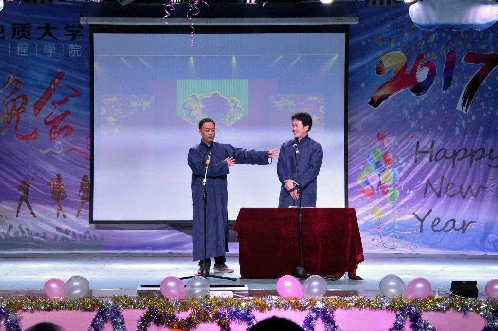 随着大屏幕上的倒计时,元旦晚会正式开始。魅力四射的开场舞将在场所有观众的激情点燃。副院长张翠军代表学院致新年贺辞。动感十足的舞蹈、风趣幽默的小品、优美高亢的歌声,精彩绝伦的相声,还有与众不同的手影舞,一次次地将现场氛围推至高潮。特别是老师们精心准备的精彩节目,幽默的相声,积极阳光的歌曲,更是赢得了在场观众震耳欲聋的掌声、喝彩声。歌声、乐声、呐喊声互相交织,师生其乐融融,共同谱写了一篇青春飞扬、激昂风采的乐章。最后,晚会在《相亲相爱一家人》的歌声中完美地落下帷幕。