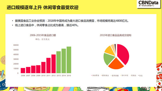 随着国民人均可支配收入的提升,消费者越来越壕,吃得也越来越讲究,线上进口食品的消费热情不断被挖掘。近年跨境电商的快速发展,线上进口食品的市场不仅成交量直线上升,市场渗透率也不断扩大。CBNData《报告》显示,按美国食品工业协会预测,到2018年,中国将吃掉4800亿元的进口食品,位居全球第一。线上进口食品销售一片畅旺,零食更是其中的“大功臣”。报告指出,休闲零食占到了线上进口食品的40%,远高于其它品类。